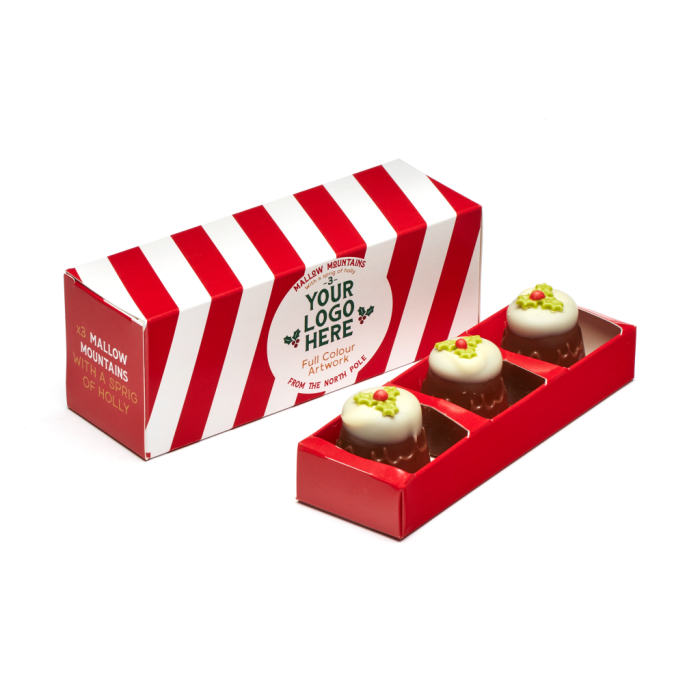A plastic free, eco sliding box filled with 3 Mallow Mountains. A chocolaty mountain covering a fluffy marshmallow, topped with white chocolate snow and a holly sprig.
