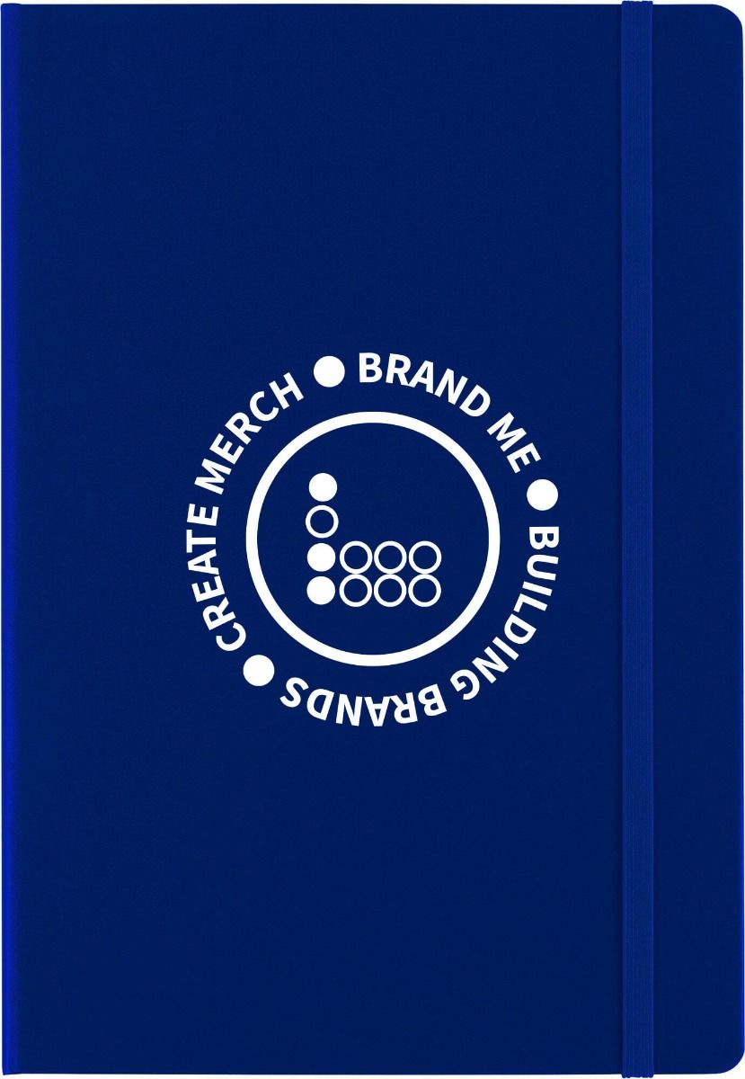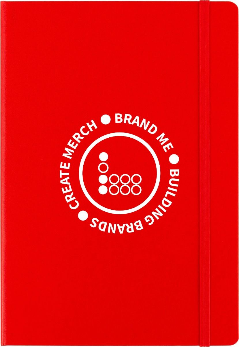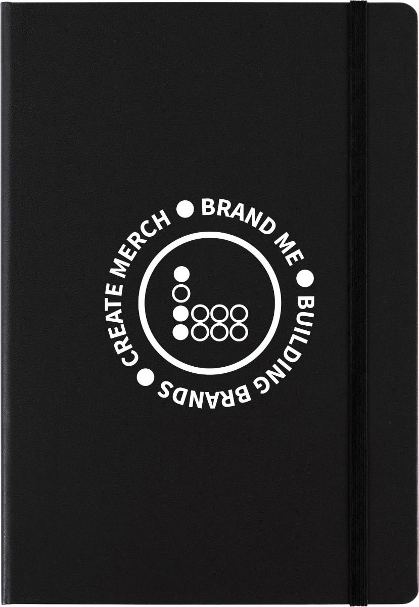 Cardboard notebook (approx. A5) with elastic band for closing. The notebook has 128 lined sheets and a paper pocket on the inside back cover. Back cover has IMPRESSION logo.