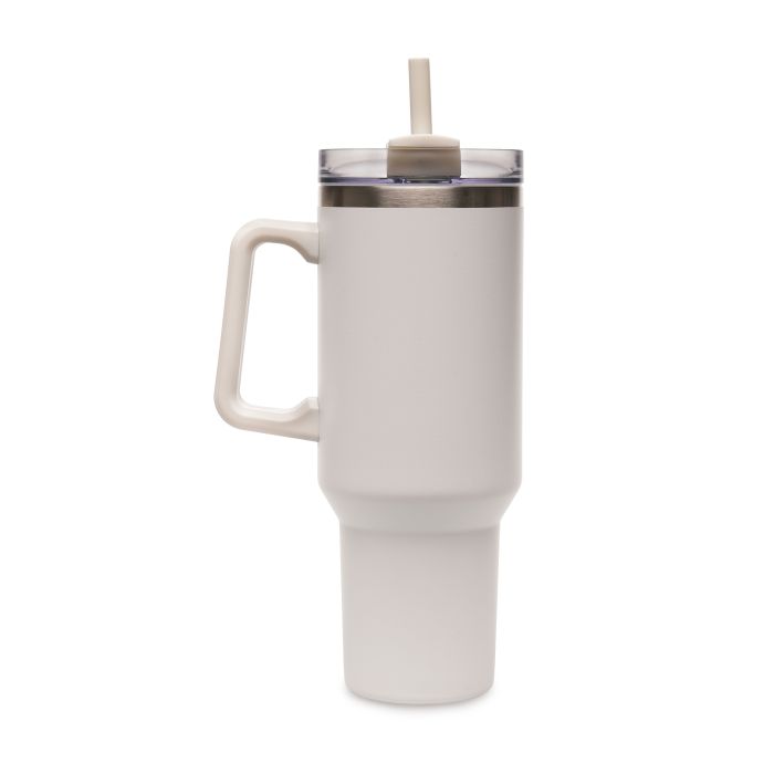 900ml double walled, recycled stainless steel travel mug with built in recycled PP handle, EVA foam bottom pad and a powder coated finish. Featuring a clear lid, recycled PP plastic coloured slider, RPE coloured straw and silicone seal. BPA & PVC free.