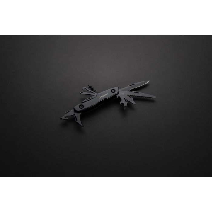 Branded Gear X Multifunctional Tool. Straight clear lines combined with great functionality. This multifunctional tool combines it all, in one pocket sized essential. The luxury aluminum body is matched with premium grade 420 stainless steel tools all presented in black. The 13 functions include: Knife, saw, slotted screwdriver, can opener, file, small Philips screwdriver, Philips screwdriver, corkscrew, thread guide, leather punch, box cutter, bottle opener and small blade. This multifunctional knife is ready for use when you need it. Packed in luxury gift box.