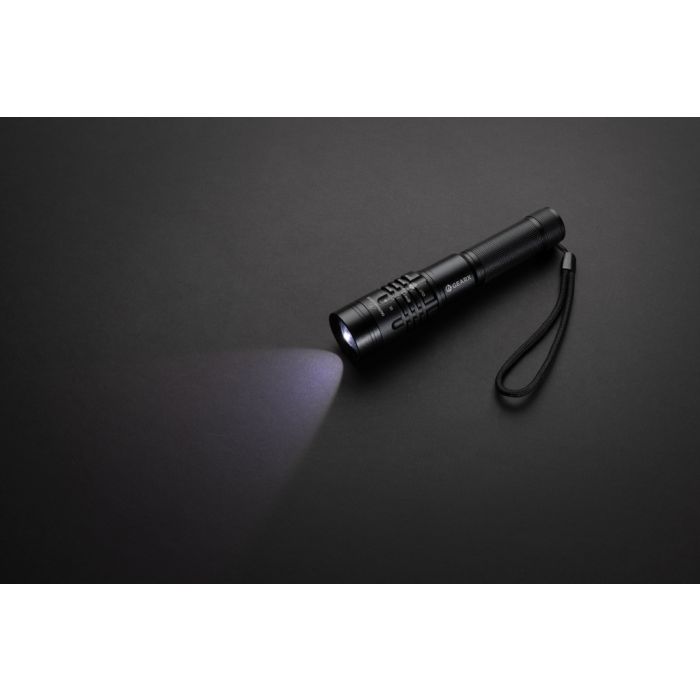 Printed Gear X USB Rechargeable Torch. Functionality, performance and design all come together in this re-chargeable torch. The high quality aluminum alloy body fits perfectly in your hand. The premium focus light allows you to extend the light up to 2000 times. Because of its IP4 rating, it is weather proof so can easily be taken outside. The powerful bulb creates up to 1000 lumen and a beam that reaches up to 500 metres. The torch uses a re-chargable battery so no need to replace the batteries. Simply re-charge via your USB socket. The high quality bulb comes with 5 modes including SOS function. The 2000 mah battery allows a usage up to 4 hours on a single charge.