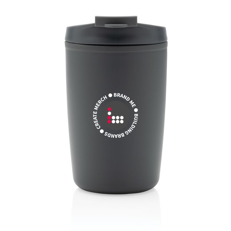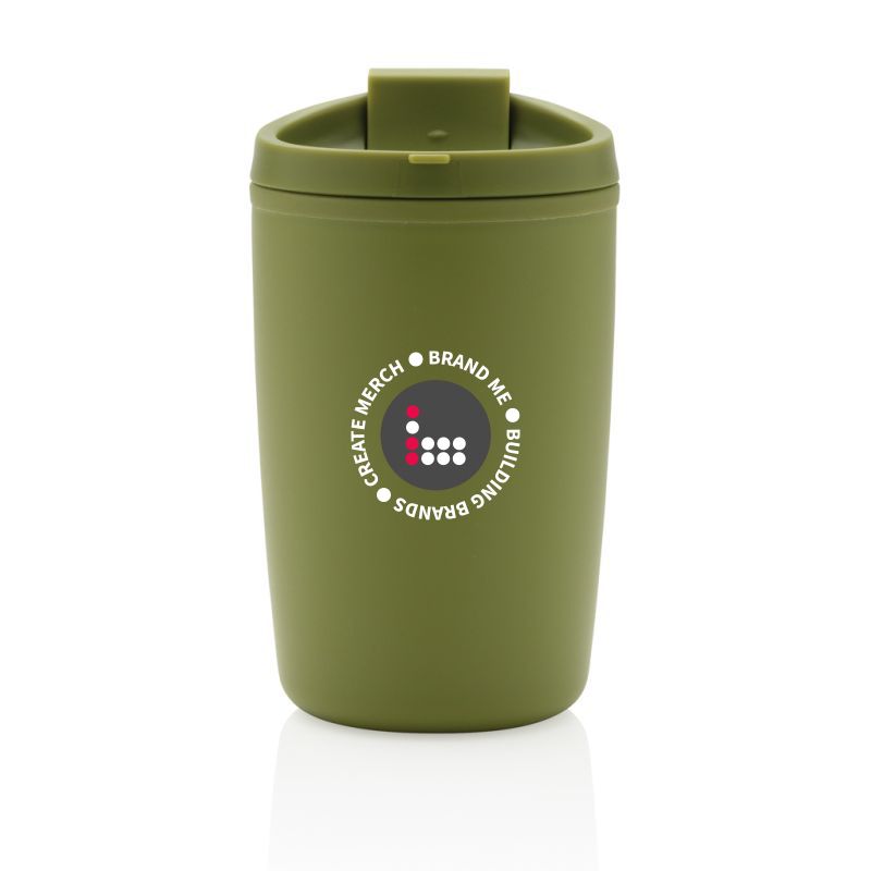Promotional GRS Recycled PP Tumbler With Flip Lid. This tumbler is made entirely with GRS certified recycled PP. GRS certification ensures a completely certified supply chain of the recycled materials. The GRS tumbler features a flip lid for convenient sipping on the go. Total recycled content: 97% based on total item weight. Microwave and dishwasher safe. BPA free. Capacity 300ml. A certified kraft box is included.