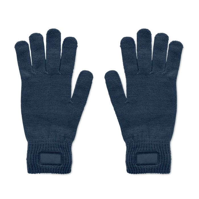Knitted gloves in soft stretchable RPET polyester with decoration patch.