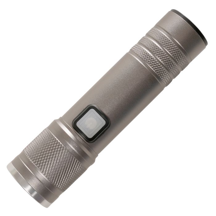 This compact LED torch features a durable aluminium body, two brightness settings, and a USB-C charging port. It includes a USB-C to USB cable for easy recharging, making it a reliable, on-the-go lighting solution.