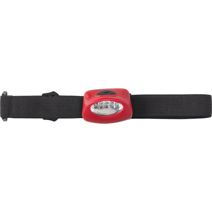 Head light with five LED lights in a plastic casing and strap for size adjustments. Batteries included.