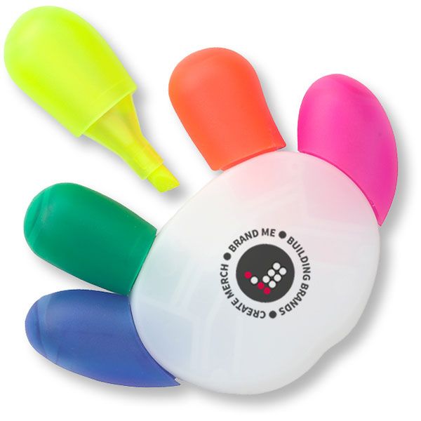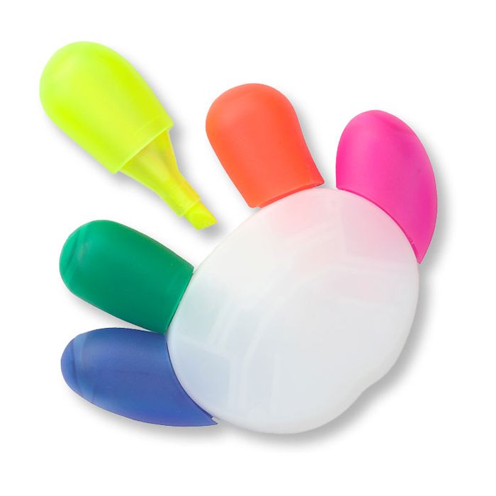 Promotional Hi Five Highlighter. Hand shaped flat highlighter featuring 5 different ink colours with 'Cap Off Ink'. The white solid highlighter holder offers a generous print area. Perfect for schools, charities or any other event.