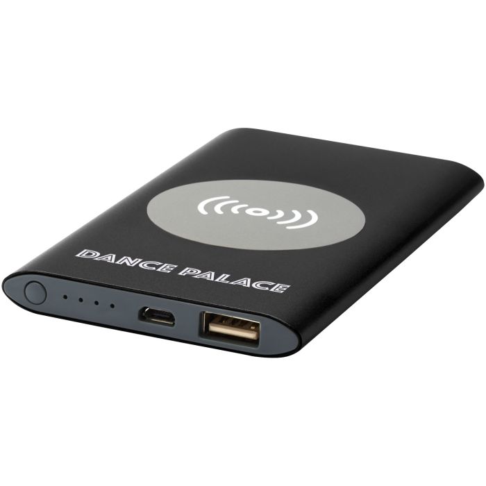 Promotional Juice Wireless Power Bank 4000mAh. Branded 4000mAh powerbank with aluminium housing. Supports 5W wireless charging and also comes with Micro USB output to enable charging by cable. With the 4000 mAh lithium polymer battery it can fully charge a smartphone. Power indicator that shows energy level at all times. Micro USB port-in: 5V/2A Output: 5V/2A. Wireless output 5W. Including PVC free TPE plastic charging cable. Delivered in a standard gift box.