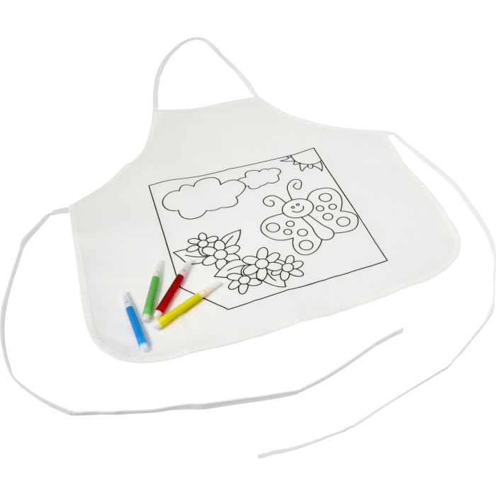 Promotional Kids Colour In Apron. Non-woven (80gr) apron which can be coloured in, supplied with four felt tip pens.