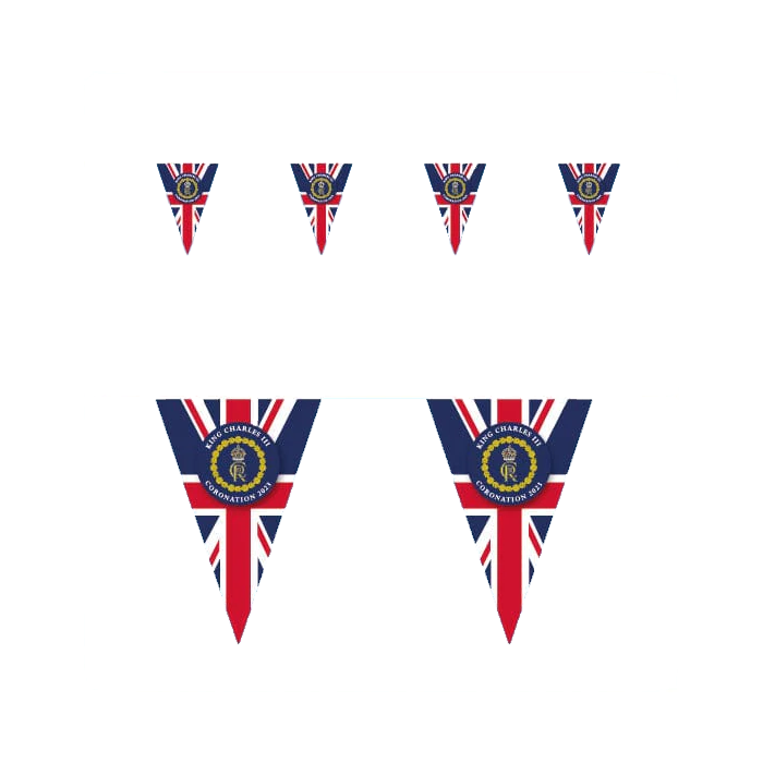 Printed King Charles Coronation Bunting Union Jack Triangle 10 Meters. Special edition Coronation outdoor bunting.