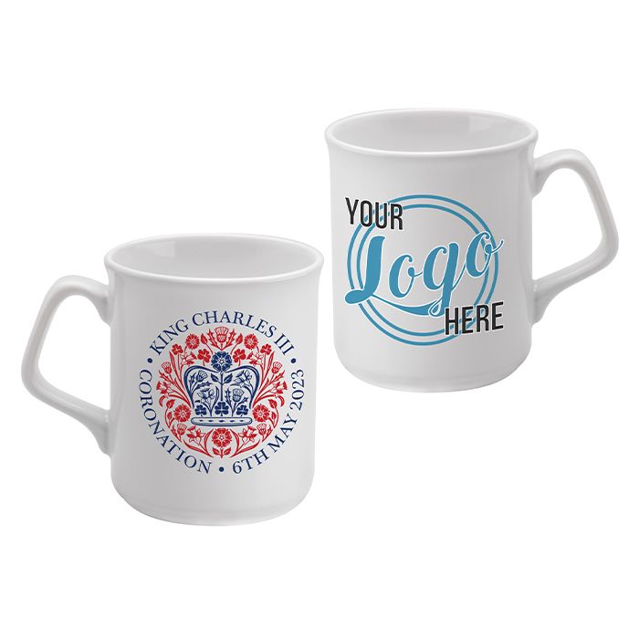Promotional King Charles III Coronation Souvenir Sparta Mug. The ever popular promotional Sparta mug. A stylish branded mug featuring slightly tapered sides and an angled handle adding a unique character. A promotional Coronation commemorative mug that will be a Royal souvenir to keep and treasure.