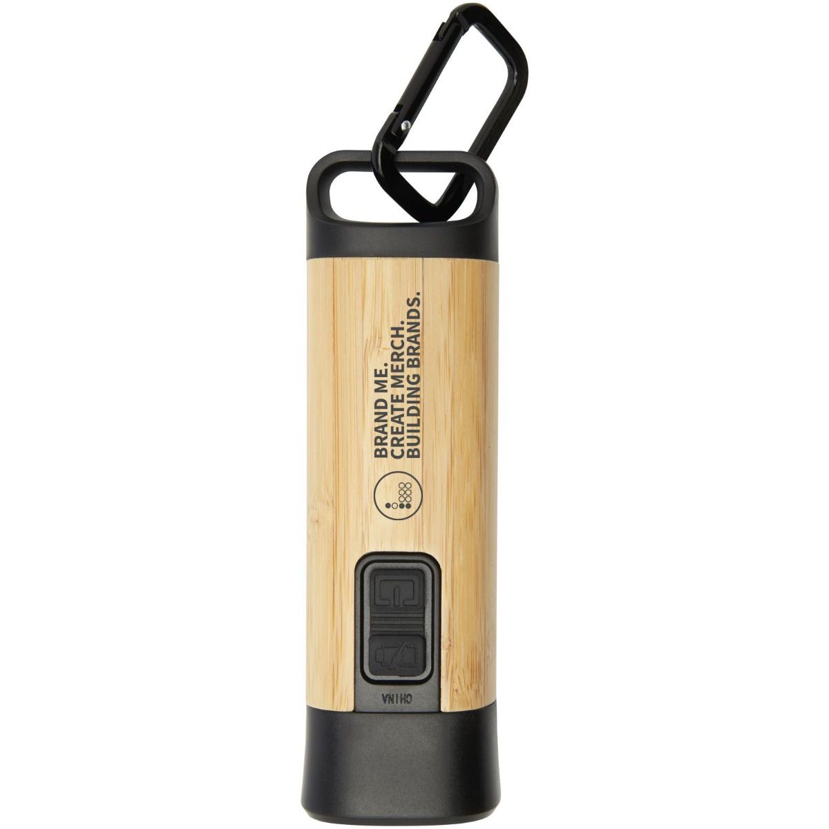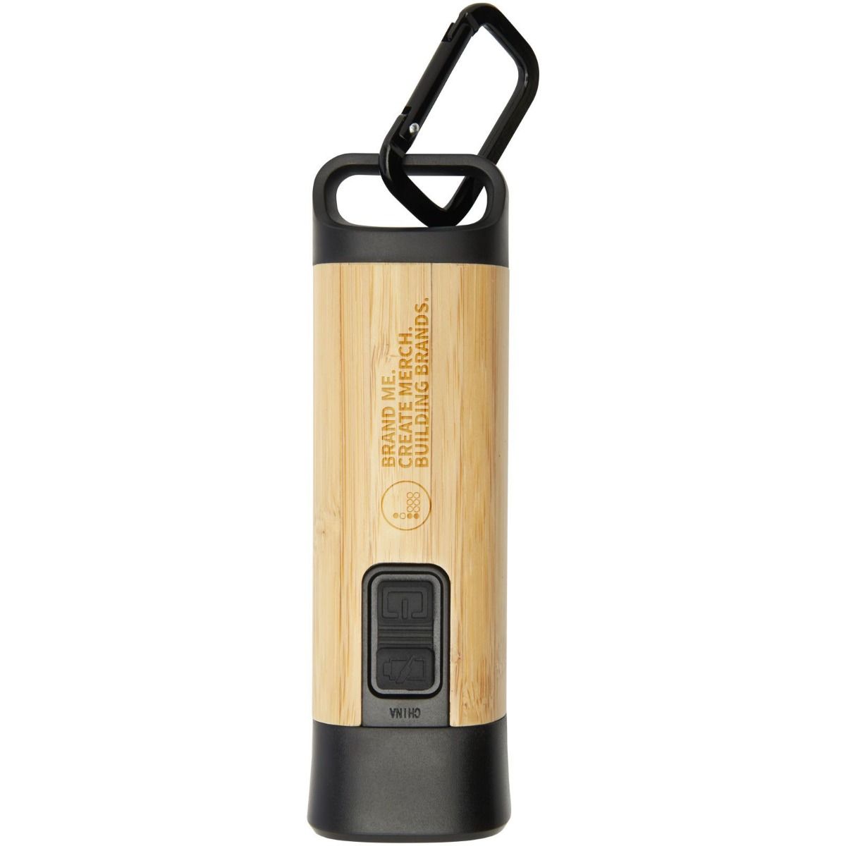 Promotional Kuma Bamboo/RCS Recycled Plastic Torch with Carabiner. The Kuma torch with carabiner is crafted from certified bamboo and 41% RCS certified recycled plastic, making it a more sustainable choice for exploring the outdoors, tackling DIY projects, or navigating power outages. Featuring a powerful 3W COB light source available in 3 different light modes, the Kuma produces 80 lumens of light with a beam distance of up to 100 meters when fully charged.