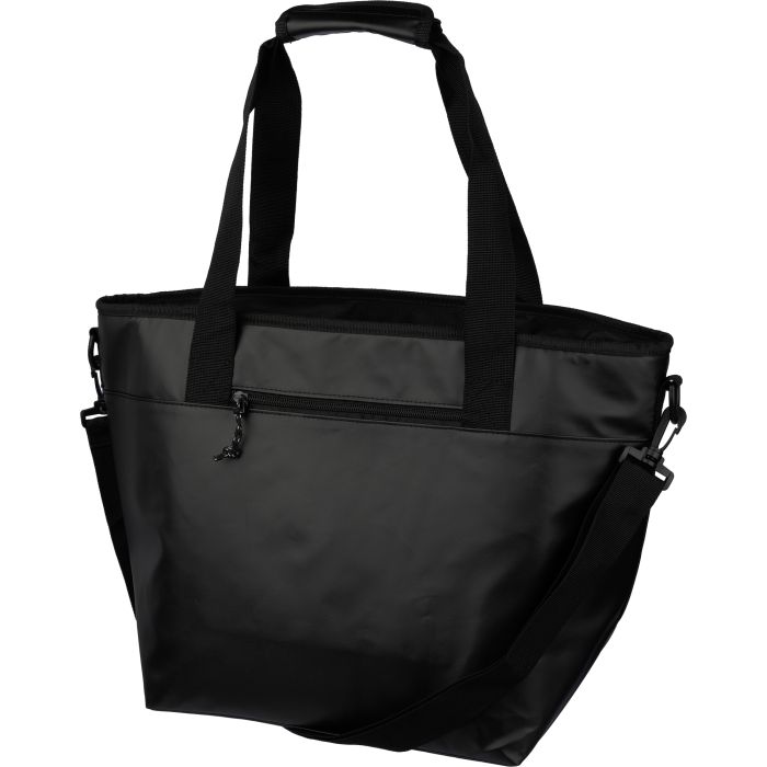 Polyester (600D) cooler carrying bag with PEVA inside and a zipped front pocket. The bag has 6mm PE foam and a waterproof interior, two carrying handles with velcro closure and an adjustable shoulder strap