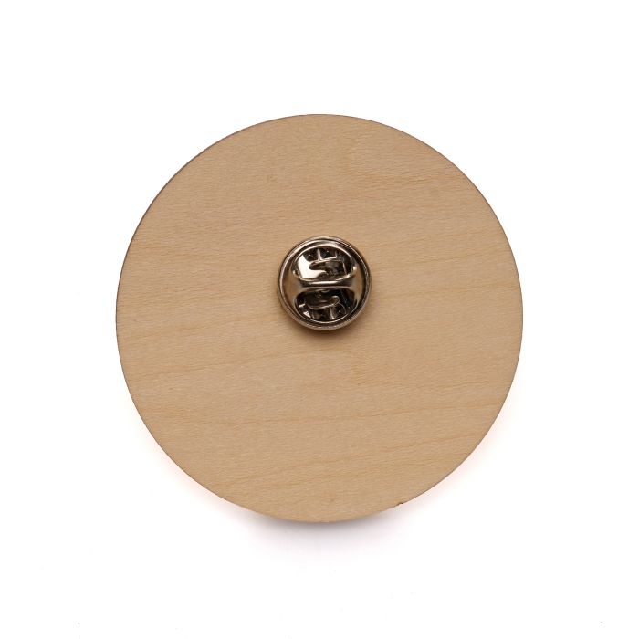 Large 50mm diameter circular 3mm thick basswood badge with butterfly clasp and a brilliant branding area for your company message.