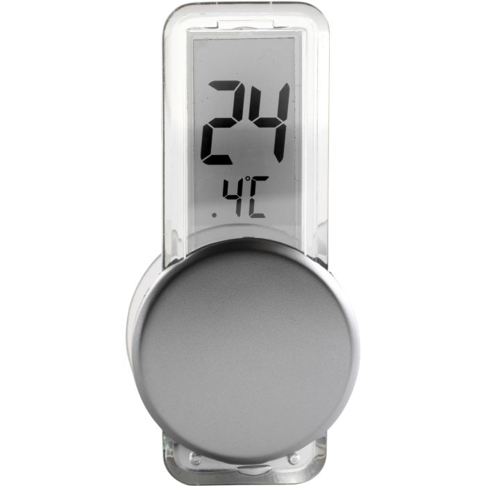 Promotional LCD Thermometer with Suction Cup. LCD thermometer with a suction cap, examines the temperature of the environment automatically six times per minute. Batteries included.