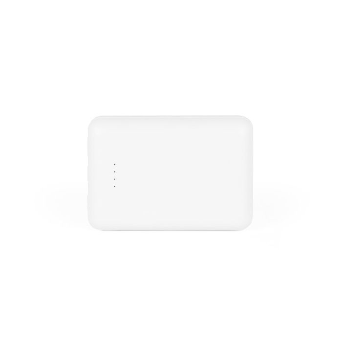 Power bank made from recycled ABS (100% rABS). Portable battery with 10.000 mAh capacity, charge level indicator, one USB-C input/output port, one microUSB input port and two USB-A output ports. Includes a USB-C charging cable. Supplied in a recycled kraft paper gift box. 92 x 64 x 26 mm | Box: 75 x 115 x 30 mm