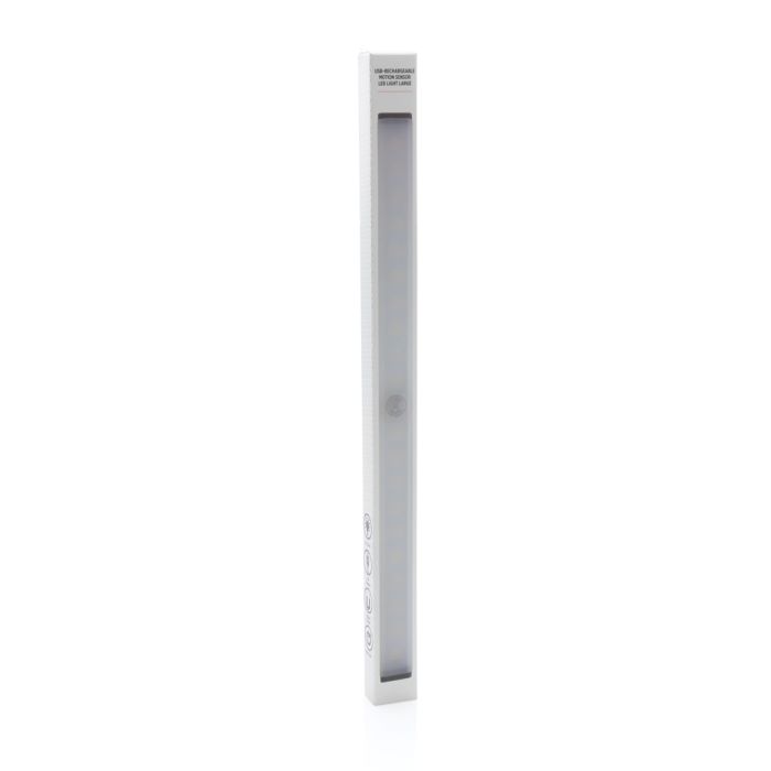 Branded LED Strip Light Large Motion Sensor USB Rechargeable. Aluminum LED strip motion sensor with 20 LED. With magnetic back panel to attach it to metal surfaces. Including 2 magnets with stickers to attach to non-magnetic surfaces. Perfect to use in the garage, above your desk, in the hallway or in your closet. Two modes: continuous or automatic sensor detection.The LED light will switch on when it detects motion and switch off after 35 seconds if no further motion is detected. With 500 mah lithium battery for continuous usage up to 3.5 hours and sensor distance up to 3 metres. 30 lumen. USB re-chargable with the included PVC free micro USB cable.