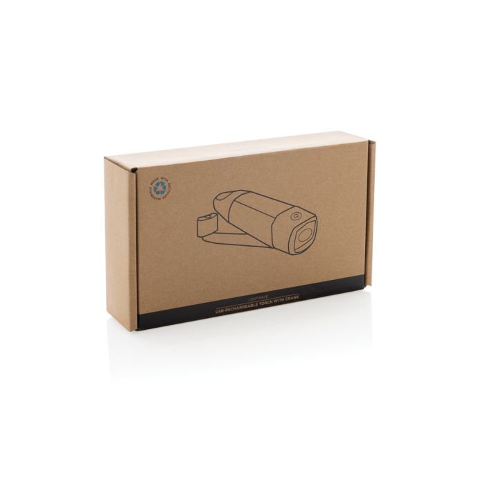 Extra bright torch with crank made with RCS certified recycled ABS plastic. Total recycled content: 30% based total item weight. RCS certification ensures a completely certified supply chain of the recycled materials. The torch uses a re-chargeable A-grade 620 mah lithium battery so no need to replace the batteries. Simply re-charge via your USB socket. 120 lumen LED light. With type C port for re-charging. Operating time on one charge: 2 hours. Crank can be used to add energy in case of emergency.