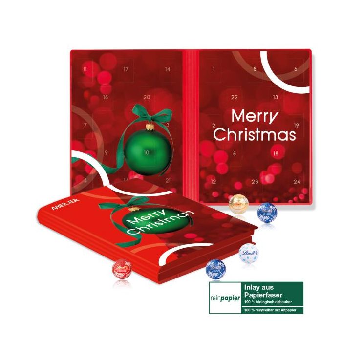 Promotional Lindt Book Calendar With Mini Balls. Lindt book calendar (240x175x50mm) containing 24 mini foil wrapped Lindor chocolate balls behind each window 110g. The calendar has a cello sleeve and can be printed with your own design or a standard design which can be overprinted with your logo or message.