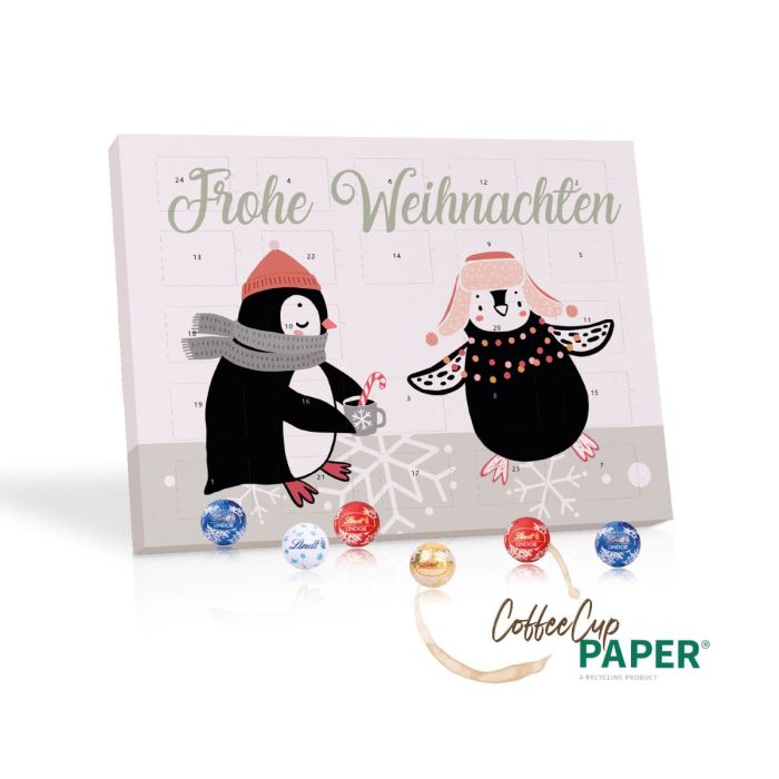 Promotional environmentally friendly Lindt Calendar. This Lindt Calendar is 100% recyclable and biodegradable and the packaging is also climate neutral. The carton and inlay are made from coffee cup paper. Lindt and Sprungli farming project promotes sustainable and ethical cocoa farming.