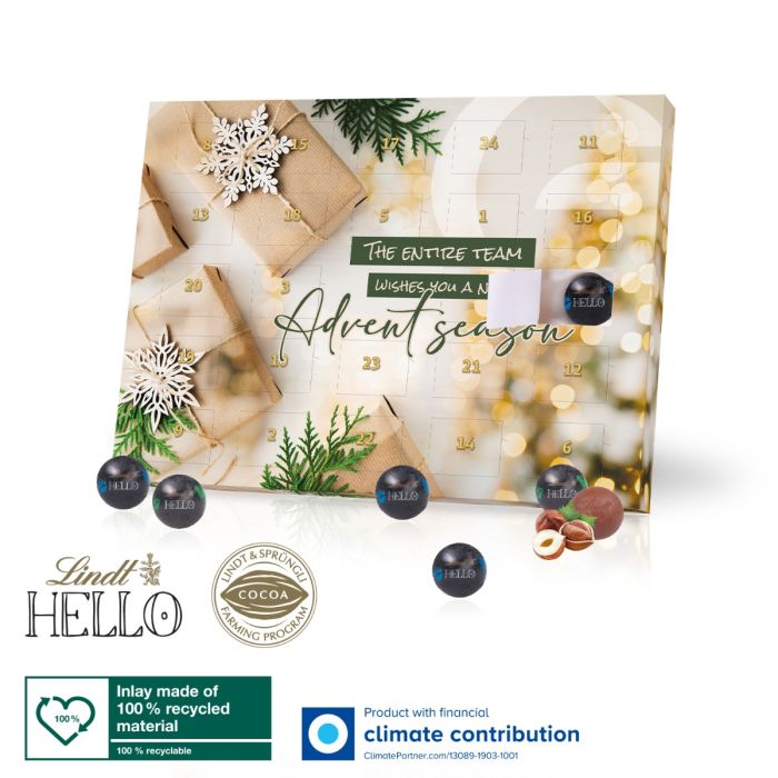 Promotional Lindt Hello desktop Advent Calendar containing 24 Lindt mini Hello balls. Fully printed all over with your own design on to Sustainable certified card. 225 x 165 x 25mm