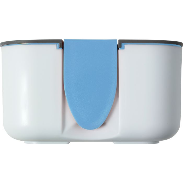 Branded Lunch Box 850ml Silicone and PP. The inside includes one separator. The closure on the lid doubles as a phone holder. Size: 19 x 12 x 7 cm.