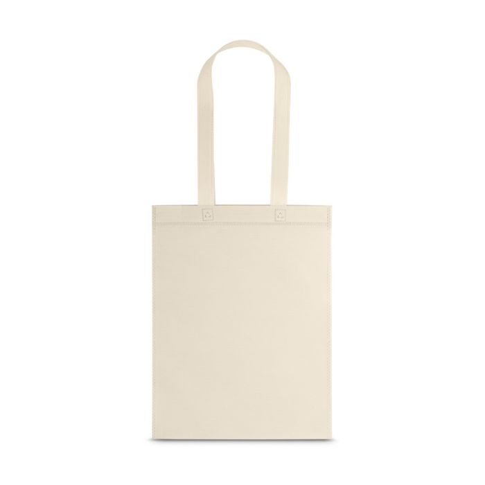 Thermo sealed non-woven bag (80 g/m²) with 55cm handles. 270 x 350 mm