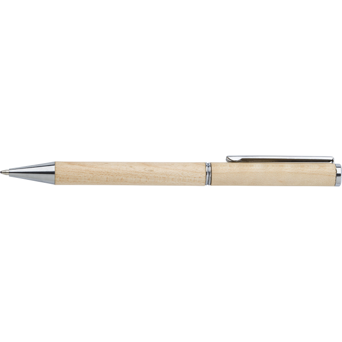 Maple wood ballpen with twist action mechanism, metal clip and blue ink.