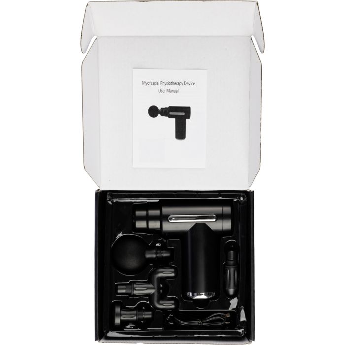 Plastic massage gun with 6 levels of intensity to massage the muscles, 4 attachments and a rechargeable battery. Individually boxed.