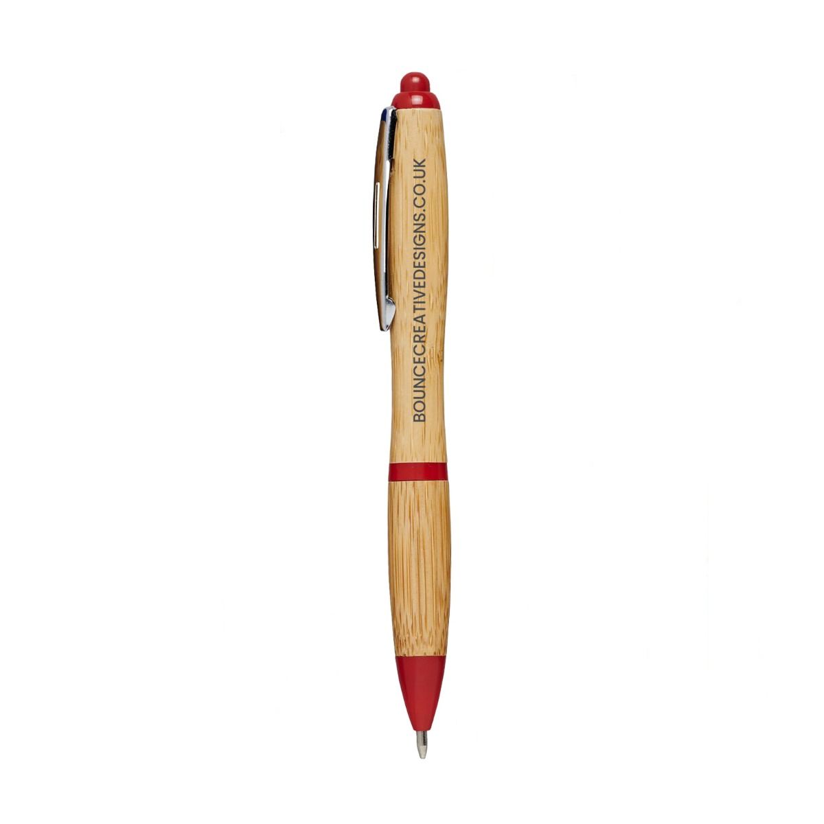 Promotional Nash Curvy Bamboo Ballpoint Pen. Low cost ballpoint pen with click action mechanism, with a barrel made of bamboo, accented by a chrome clip and ABS plastic trims. Bamboo material colour may vary.