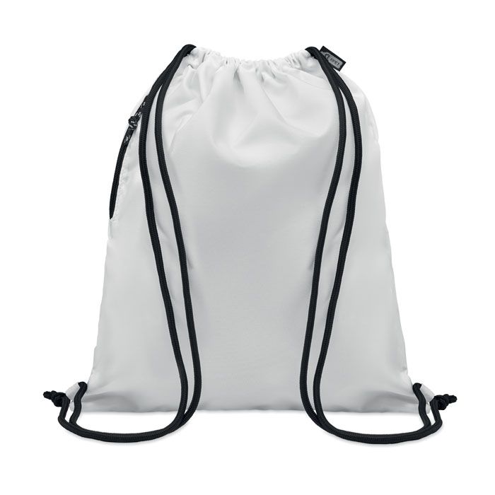 Promotional NIGHT Recycled Large Drawstring Bag 300D RPET. Large drawstring bag in 300D RPET polyester with side zippered outer pocket.
