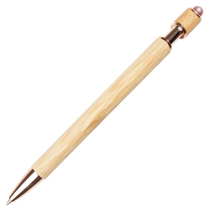 The promotional bamboo ball pen with rose gold trim and stylus is a premium writing tool featuring a natural bamboo barrel and rose gold stylus.