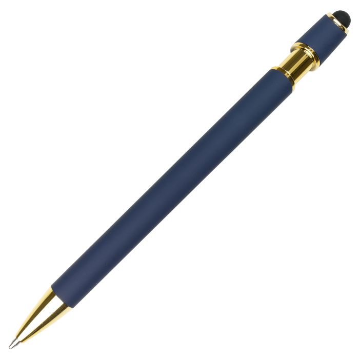 A sleek modern design in this soft feel ball pen with gold trim and stylus. Undercoated for a gold engrave finish.