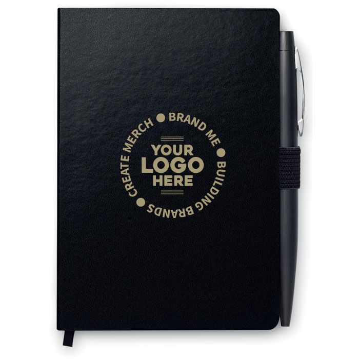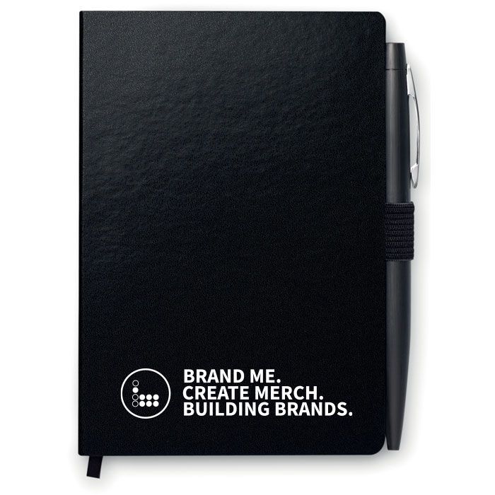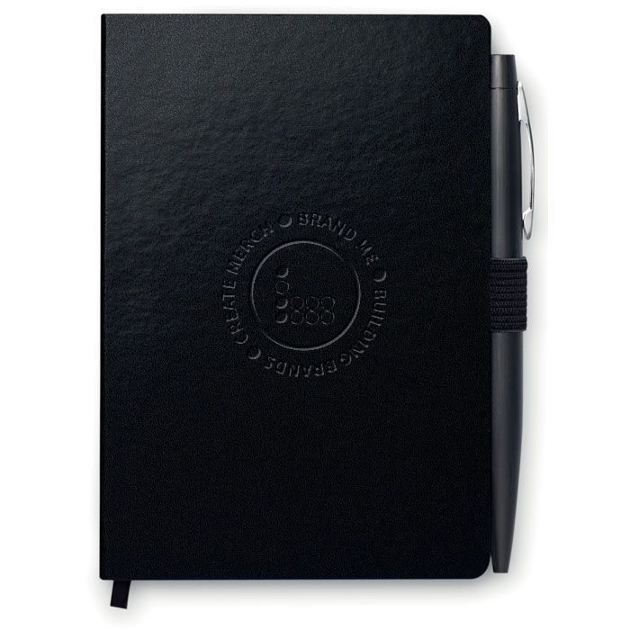 Promotional NOTALUX A6 Pocket Notebook With Matching Pen. A6 notebook with pen. Hard PU cover. Casebound. 144 lined pages (72 sheets). Matching elastic closure strap and pen holder. Matching metal push button ball pen. Blue ink.