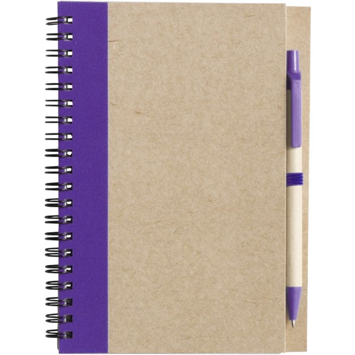 Wire bound notebook with ballpen, with approx. sixty pages made from 100% recycled paper and a bio fabric coloured material, includes a pen with biodegradable parts, blue ink.