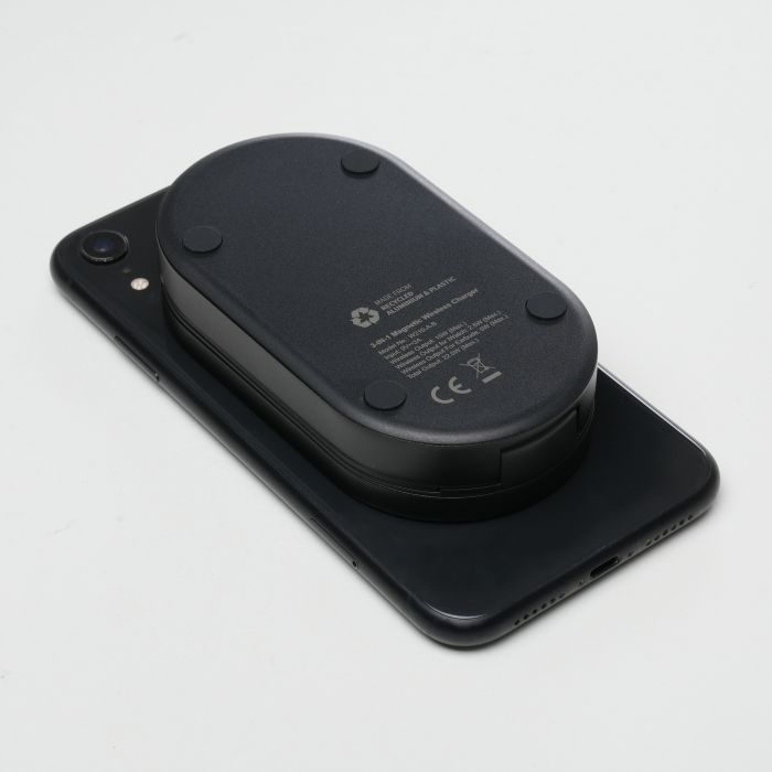 Magnetic wireless desk charger delivers fast charging for your QI-enabled phone, Apple Watch, and wireless charging earphones simultaneously, with up to 22.5W total output. It opens into a stand with a weighted base, rubber feet, and comes with magnetic ring adaptor for non-magnetic phones that charge wirelessly. Built with a recycled aluminium outer shell, recycled PC, and recycled ABS inner. Includes 100cm braided USB-C to USB-C charging cable. Suitable for Apple watch only, and most QI enabled phones and earphones.