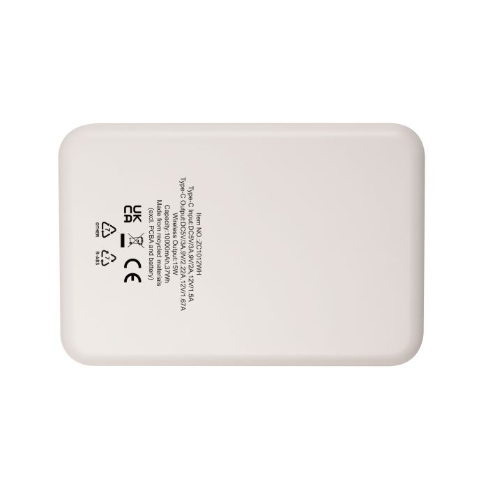 A 10000mAh wireless magnetic phone charger with a Type-C input port, supplied with a USB to Type-C charging cable. Featuring a durable recycled ABS cover, this power bank offers cable-free charging on the go.