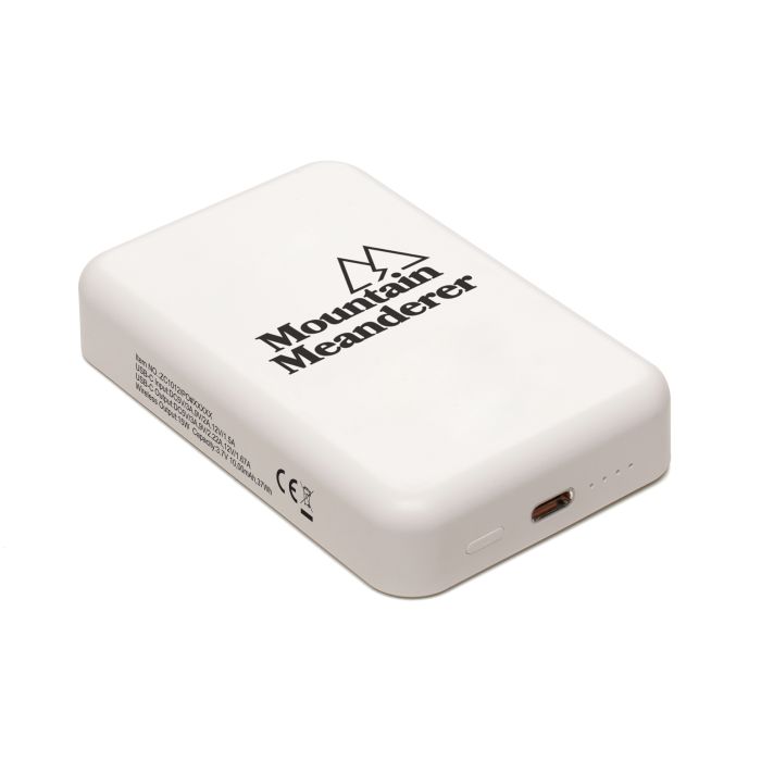 Magnetic wireless power bank with 15W fast charging for Qi-enabled phones and extra-large 10000mAh Lithium battery capacity. Also comes with adhesive metal ring (for non-magnetic, phones that charge wirelessly). Made with a recycled ABS cover. Includes 30cm USB-C to USB-C charging cable.
