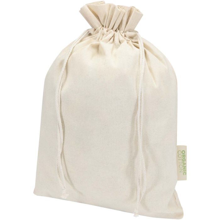 Promotional Odisha 140 g/m² OCS Organic Gift Bag - 42 x 30 cm. Gift bag made of 100% OCS certified 140 g/m² organic cotton featuring a cotton drawstring closure. Ideal for gifting or storing items. Size: 42 x 30 cm.