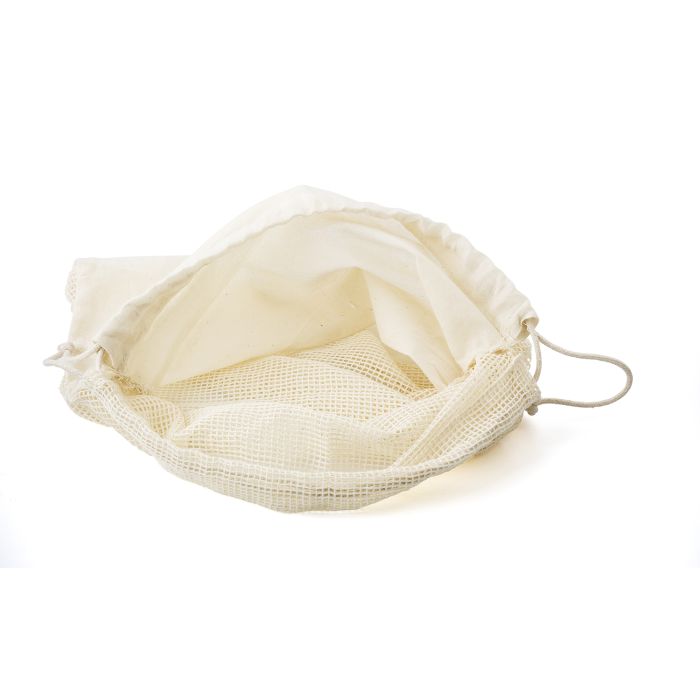 Organic cotton drawstring bag of which one side is cotton and the second side, mesh