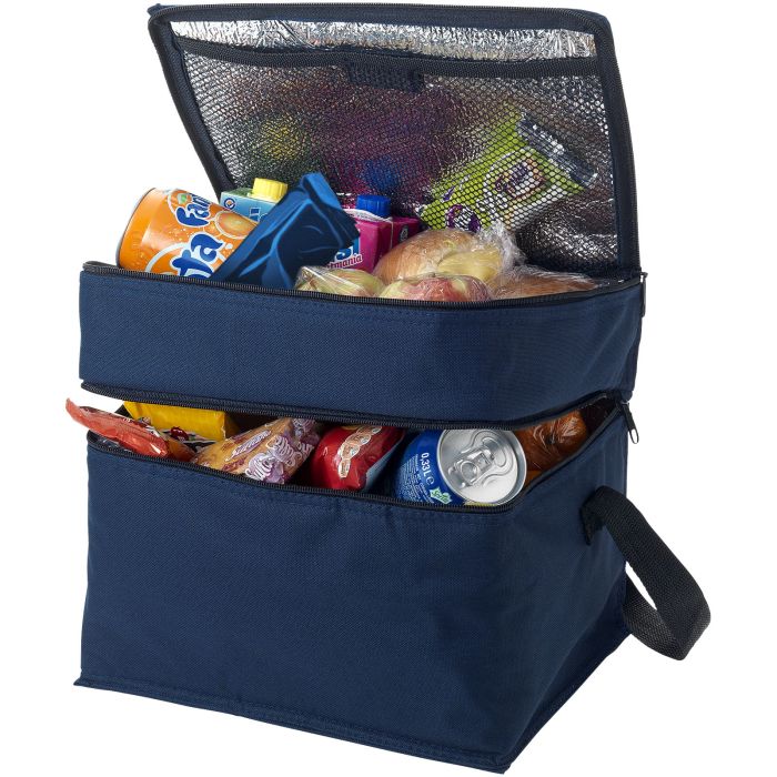 Branded Oslo Cooler Bag With 2 Zippered Compartments. Be assured of cooled drinks and snacks anytime and anywhere with the Oslo cooler bag. The cooler bag has two separate zippered compartments. The upper part is perfect for storing small snacks, and the lower part is ideal for larger groceries. The shoulder strap is adjustable, so the bag is easy to carry by everyone. The cooler bag consists of 600D of polyester, a heavy-duty and durable fabric.