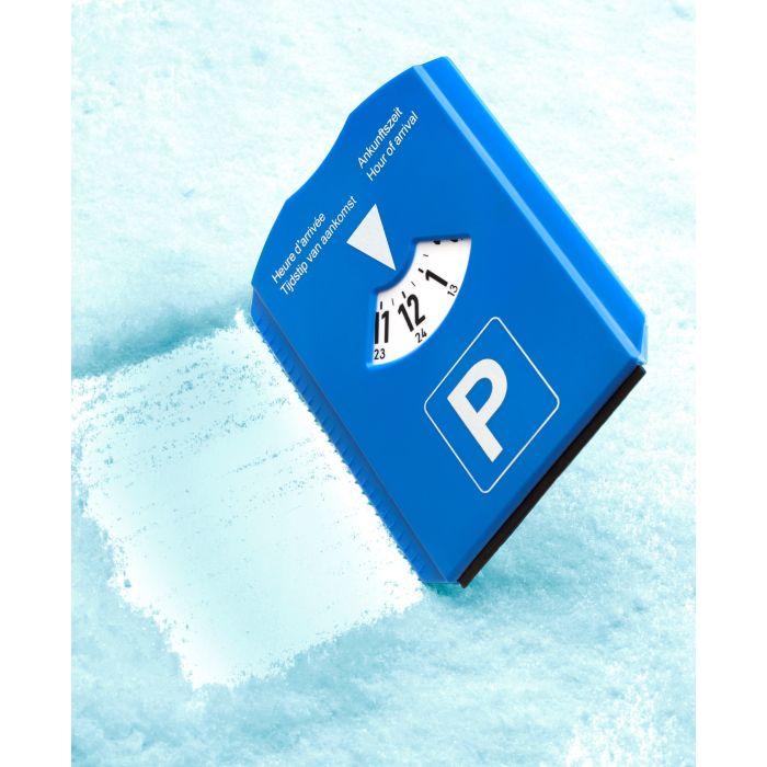 Parking disc and ice scraper with three plastic shopping trolley coins in the back.