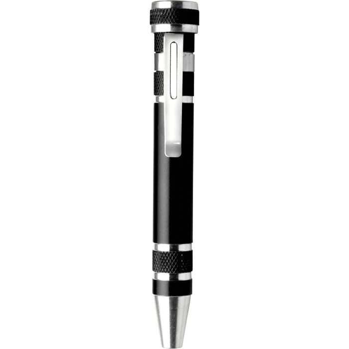 Steel pen shaped screwdriver with four flat head and four Philips screwdriver bits and aluminium accents and clip.