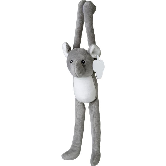 Plush elephant with long arms that have a Velcro closing, embroidered eyes and an ear tag for printing.
