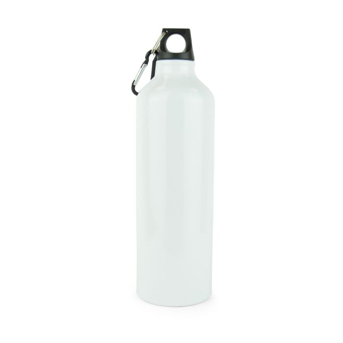 750ml single walled glossy aluminium drinks bottle with black screw on PP plastic lid and black carabiner. BPA & PVC free.