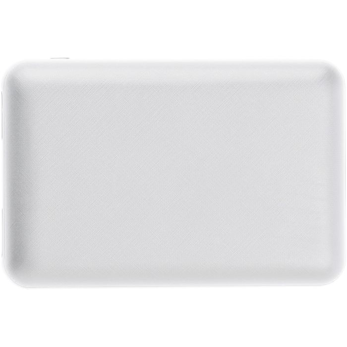 Plastic power bank with a capacity of 10.000 mAh. It has two standard USB ports and one micro USB port. Cable included. Input DC 5V/1500mA. Output DC 5V/1000mA, 2100mA.