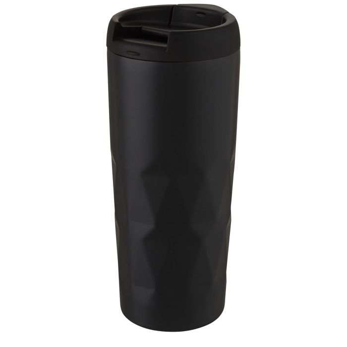 Double-walled copper vacuum insulated tumbler with screw-on leakproof lid featuring an intricate geometric design. The insulated 18/8 stainless steel keeps drinks hot or cold for several hours. BPA-free and tested and approved under German Food Safe Legislation (LFGB), and tested for phthalates content according to REACH regulations. Volume capacity is 450 ml. Hand wash recommended. Presented in a recycled cardboard gift box.