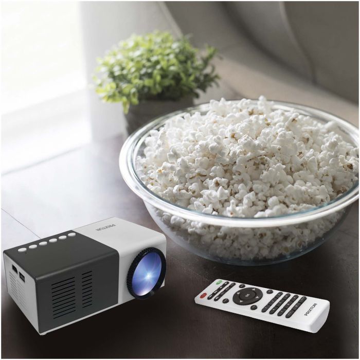 The Cinema mini projector reproduces videos with high image quality and is compatible with 1080p full HD, as well as 1080i ,720p, 576i, 480p, and 480i via HDMI. Includes a remote control for greater comfort and two stereo speakers. Aside from video it can also project audio, photos, and text.
