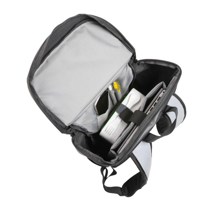 Printed PU High Visibility Laptop Backpack. This high visibility easy access laptop backpack is the ideal backpack to carry every day and provides extra safety at night thanks to the big surface of reflective material which ensures you are visible to traffic. The backpack has all the space you'll need in a day bag or carry-on. The roomy main compartment has a 15.6" laptop pocket and a small pocket to quickly grab your phone or keys. The big zipper opening makes it easy to see what's in your backpack at a glance. Water resistant. The reflectivity has been tested in accordance with EN 13356:2001.
