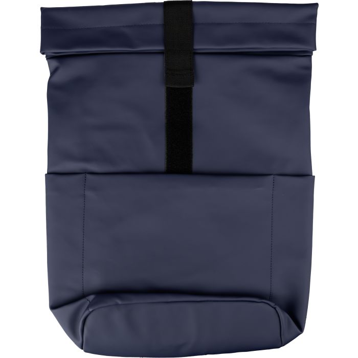 PU leather roll-top backpack with PU lining, a laptop pocket (15 inch) and a zipped pocket on the front side.