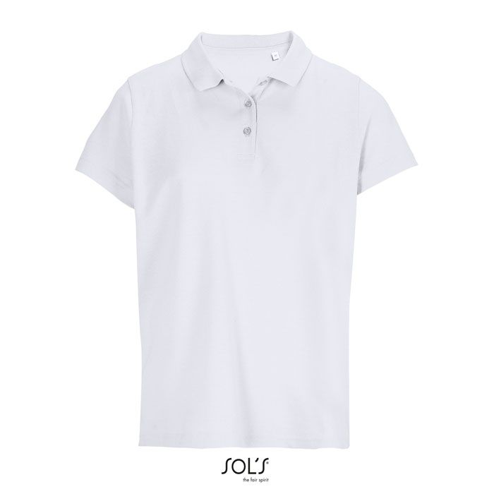 SOL'S PULSE WOMEN POLO, women's polo shirt, 100% ring-spun combed cotton, new fit, ribbed collar, neck tape, reinforced button placket, short sleeves, tone-on-tone 3-button placket, straight hem, cut and sewn, spare button on inside side seam. For size information, please refer to the size chart in the product documentation.